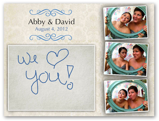 Photo Booth Are you looking for an affordable, fun, easy to use photo booth solution for your wedding? Our Photo Booth creates incredible memories for you and your guests! An easy to use interface takes three photos taken in short succession. Then your guests write a note or drawing on the screen of an iPad. Finally, your guests can choose to print a copy of their creation on 8.5"x11" photo paper as a keepsake. The entire collection of photo booth pictures and messages is uploaded to our website for viewing within 24 hours where you and your guests can view, share and download the images. Our web site offers easy printing and sharing to social network web sites. You keep a disc with all of the images.